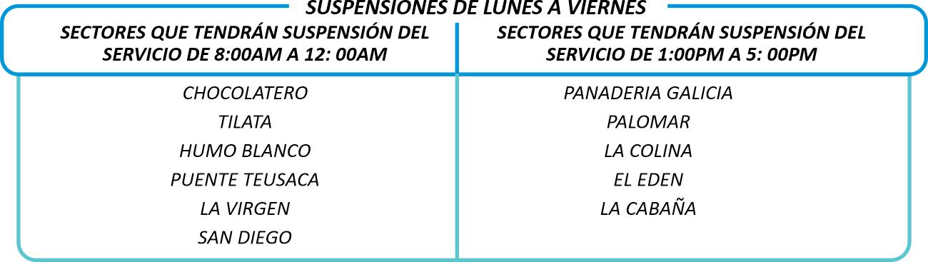 De acuerdo a la programación anterior se aclara que las interrupciones del servicio serán únicamente de lunes a viernes y se iniciaran a partir del día Miércoles 25 de Noviembre, por un lapso aproximado de 30 días mientras se adelantan las obras programadas.